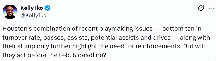 乍一看,考虑到当前的形势,火箭队在交易截止日前保持谨慎态度是可以理解的。但如果球队持续表现不佳,在积分榜上的排名继续下滑,那么管理层很可能会做出调整。
