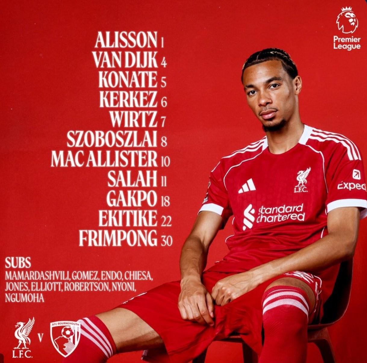 利物浦即将在2025/26赛季英超联赛揭幕战主场迎战伯恩茅斯,目前他们已经公布了本场比赛的首发阵容。
